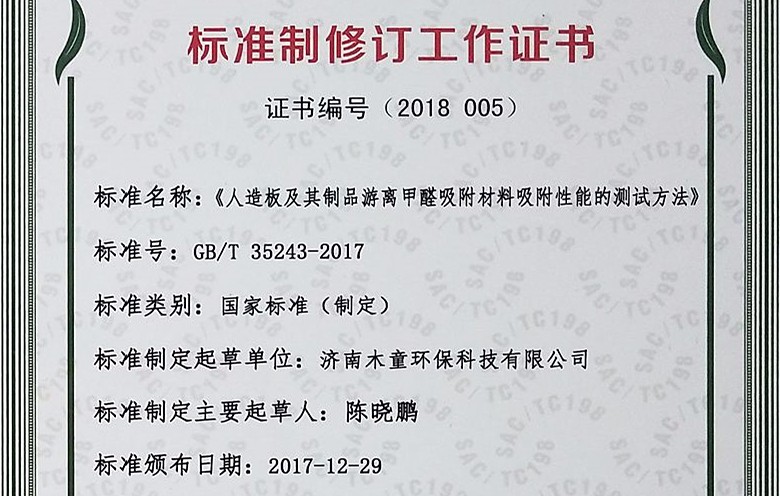 室內空氣污染治理行業是涉及到民生健康福祉的行業,新一屆政府特別重視,上海木材研究所作為國內主要的人造板研究單位,申請了《人造板甲醛吸附材料吸附能力的測試方法》國家標準的起草制定工作,由全國人造板標準化技術委員會(SAC/TC198)歸口。
